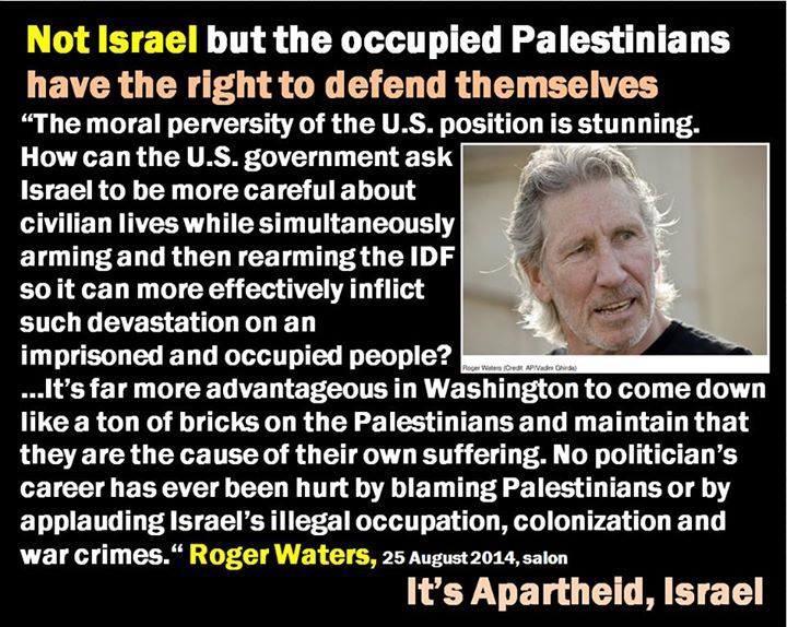 „Perversitatea morală a poziției Statelor Unite este uimitoare. Cum poate guvernul SUA cere Israelului să fie mai atent cu privire la viața civililor în timp ce SUA ajuta la inarmarea și apoi reînarmarea IDF-ului(Israel Defense Forces), astfel încât să poată provoca cat mai eficient devastarea unui popor închis și ocupat? … Este mult mai avantajos în Washington sa-i acuzi pe palestinieni și sa susții că ei sunt cauza propriei lor suferințe. Niciodata cariera vreunui politician nu a avut de suferit dand vina pe palestinieni sau aplaudand ocupația ilegala, colonizarea și crimele de razboi ale Israelului”.