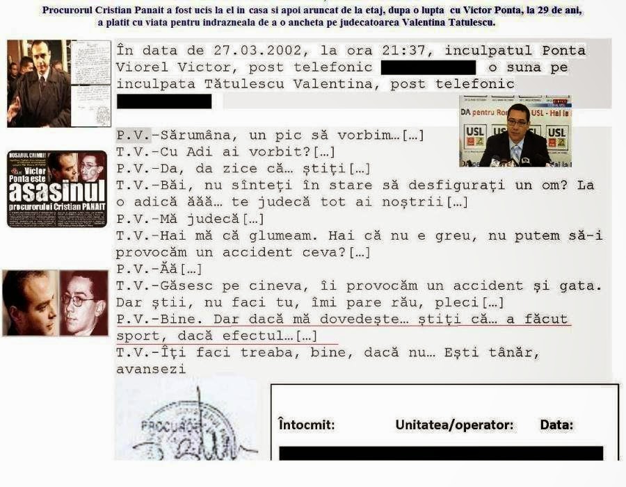 Conținutul acestei convorbiri telefonice spune totul în legătură cu crima ce urma să se producă prin «accident» pe care urma să o facă Victor Ponta la ordinul lui Adi (diminutivul lui Adrian Năstase) și a sfaturilor profesionale date de judecătoarea călău, Valentina Tătulescu. Aș putea chiar afirma că această piesă, pe care nimeni până la această dată nu a luat-o în  seamă, este cea mai importantă din tot dosarul, deoarece ea confirmă, fără echivoc, faptul că Ponta a fost însărcinat cu punerea în aplicare a deciziei lui Adrian Năstase de a-l omorâ pe procurorul Panait.