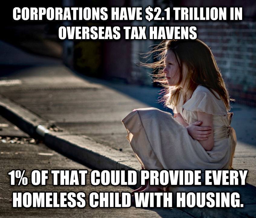 Corporațiile din SUA au ajuns la un record de 2.1 trilioane dolari în paradisuri fiscale, off-shore, potrivit unui nou raport. Pentru a pune că în perspectivă, 1,1% din aceste profituri neimpozitate ar putea oferi locuințe pentru 2,5 milioane copii fără adăpost care locuiesc în acest moment in Statele Unite. Acest lucru este mai mult decat revoltător.