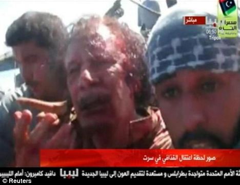 Fostul lider Libian Muammar Gaddafi, acoperit de sange, este tras afara din camion de catre  luptatorii NTC in Sirte inainte de a fi ucis.