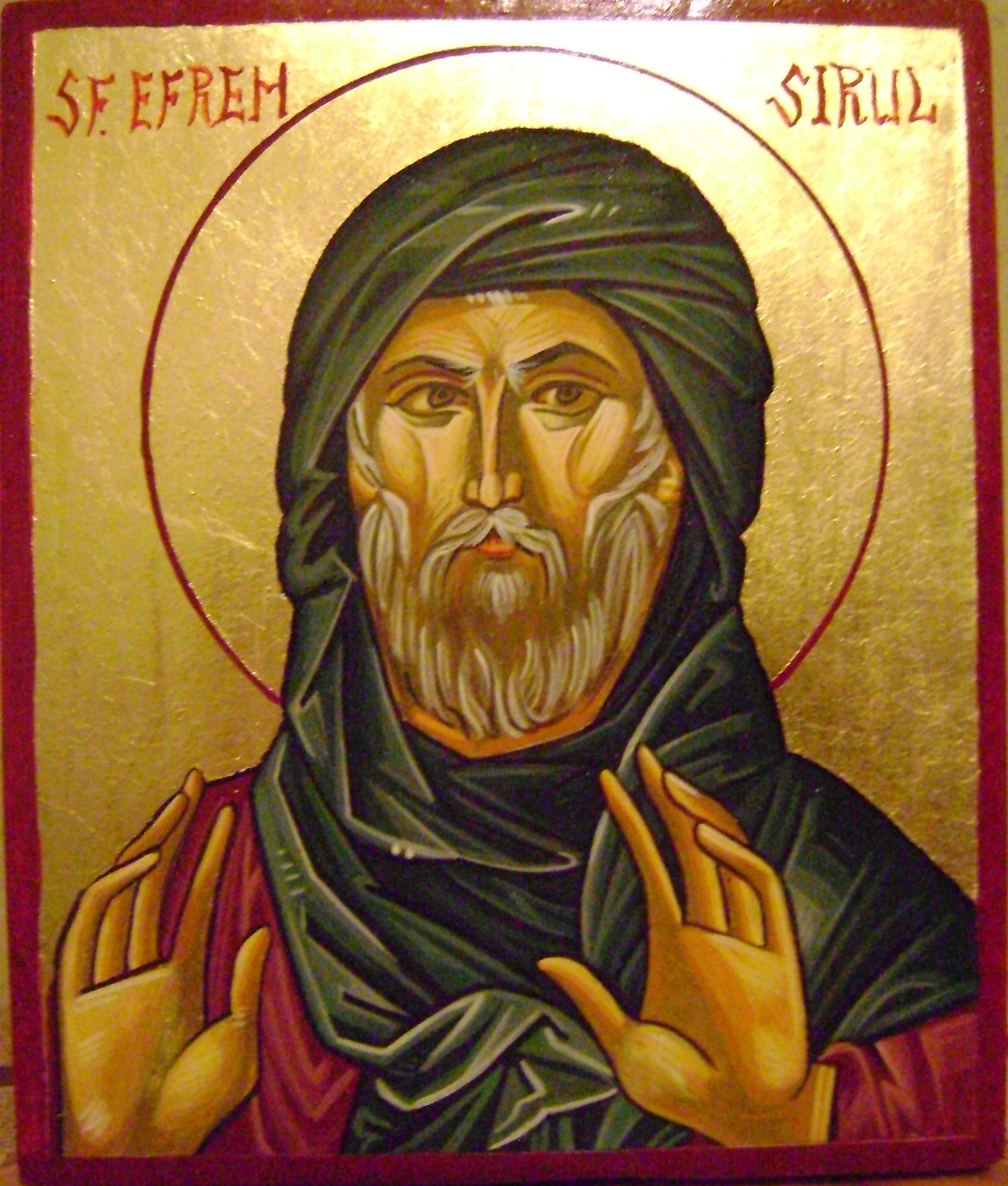Lepădându-se de toate, precum Apostolii, luptându-se ziua cu foamea şi noaptea cu somnul, învăluindu-şi faptele precum şi vorbele în sfânta smerenie a lui Hristos, primi de la Dumnezeu harul căinţei şi al lacrimilor neîncetate, într-o asemenea măsură încât el ocupă în Corul Sfinţilor locul ales de „dascăl al căinţei”. Printr-o minune ce se face cunoscută doar celor care se jertfesc cu totul Domnului, ochii săi fuseseră transformaţi în două izvoare nesecate de lacrimi. Ani întregi, zi şi noapte, aceste ape luminoase, purificatoare şi purtătoare de sfinţenie, acest al doilea botez al lacrimilor, nu încetară să curgă din ochii săi, transfigurându-i faţa într-o sclipire limpede, în care se oglindea prezenţa lui Dumnezeu. Plângea fără încetare pentru păcatele sale sau ale oamenilor, şi uneori, când se lăsa purtat de contemplarea minunăţiilor pe care Dumnezeu le-a făcut pentru noi, plânsul său se preschimba în lacrimi de bucurie. Ca un cerc misterios, în care nu ne putem da seama unde e începutul nici sfârşitul, gemetele năşteau în el lacrimile ; lacrimile, năşteau rugăciunea ; rugăciunea năştea propovăduirea, care era întreruptă de noi tânguiri. Citind încântătoarele sale discursuri despre căinţă sau descrierile atât de realiste ale Judecăţii de Apoi, chiar şi inimile cele mai împietrite nu pot să nu se înmoaie. Pentru multe generaţii şi până în ziua de azi, lecturile din Sfântul Efrem au făcut să curgă multe lacrimi, deschizând păcătoşilor calea pocăinţei şi a creştinării.
